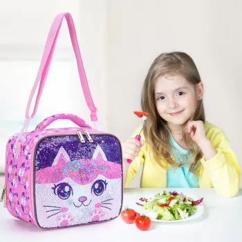 Cute Sequin Kitty Lunch Bag for Girls with Glow-in-the-Dark Function