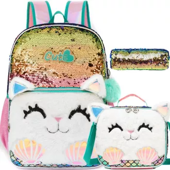 Cute Cat Sequin Backpacks for Girls with Lunch Box and Pencil Case